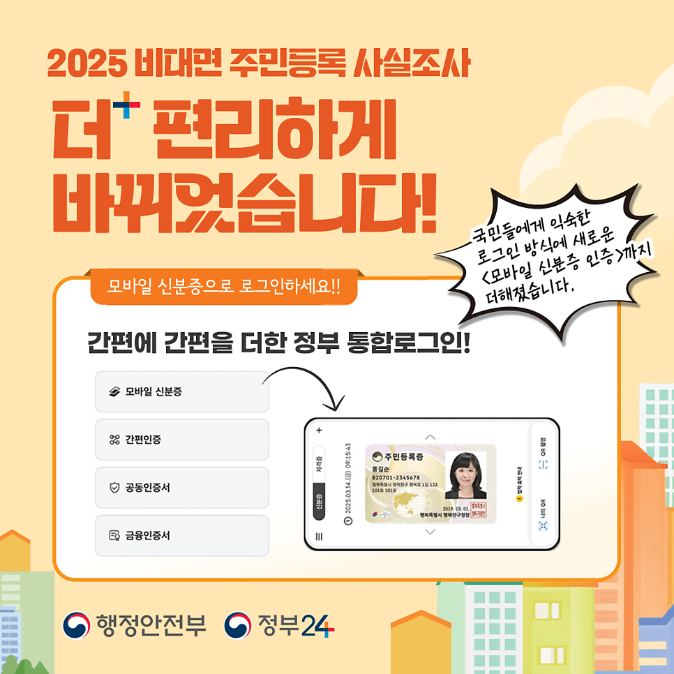2025년 7월 21일부터 시작된 주민등록 사실조사 간편하게 휴대폰으로 참여할 수 있습니다. 지금 놓치면 현장 방문조사를 받아야 합니다. 8월 18일까지 비대면 참여하면 선물까지 챙길 수 있으니 기간 내 참여하세요.
