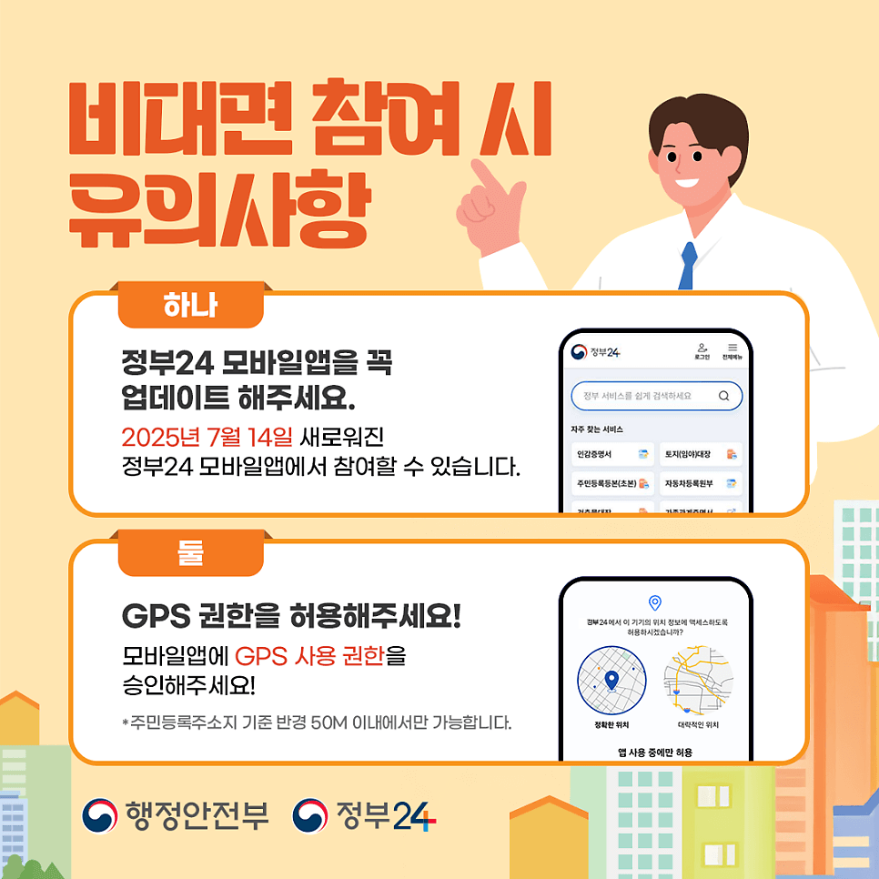 | 비대면 참여 방법 | 정부24 앱 → 배너 클릭 → 본인확인 → 응답 / GPS 필요 / 주소지 50m 이내 |